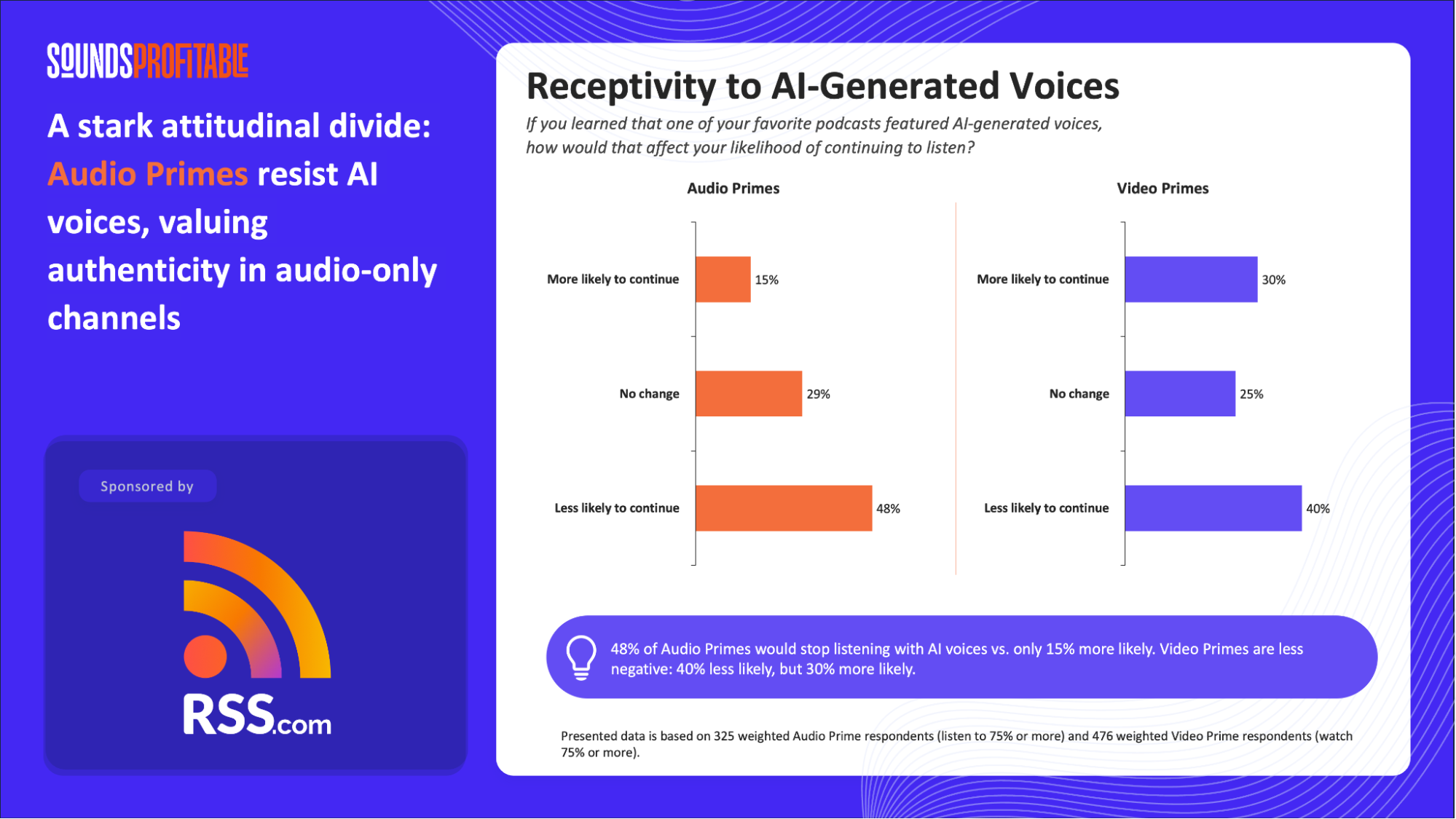 48% would be less likely to keep listening if a favorite show used AI-generated voices, versus only 15% who would be more likely â a stark authenticity premium that has direct implications for AI production tools
