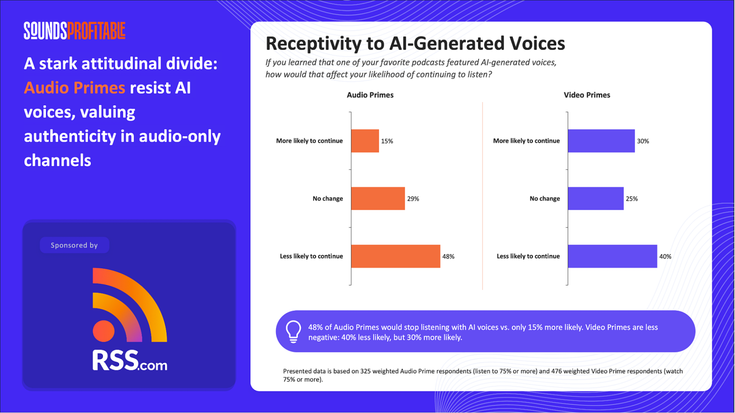 The split reveals something structural about how different audiences have been conditioned by the platforms they use. Video Primes have spent years inside TikTok and YouTube ecosystems saturated with AI avatars, synthetic narrators, and deepfake influencers. Theyâve already made their peace with artificial voices. Audio Primes havenât â and the reason is almost architectural: for audio-first listeners, the voice is the medium. Thereâs nothing else there. Swapping it for a synthetic version isnât a production decision. Itâs a substitution of the core product.