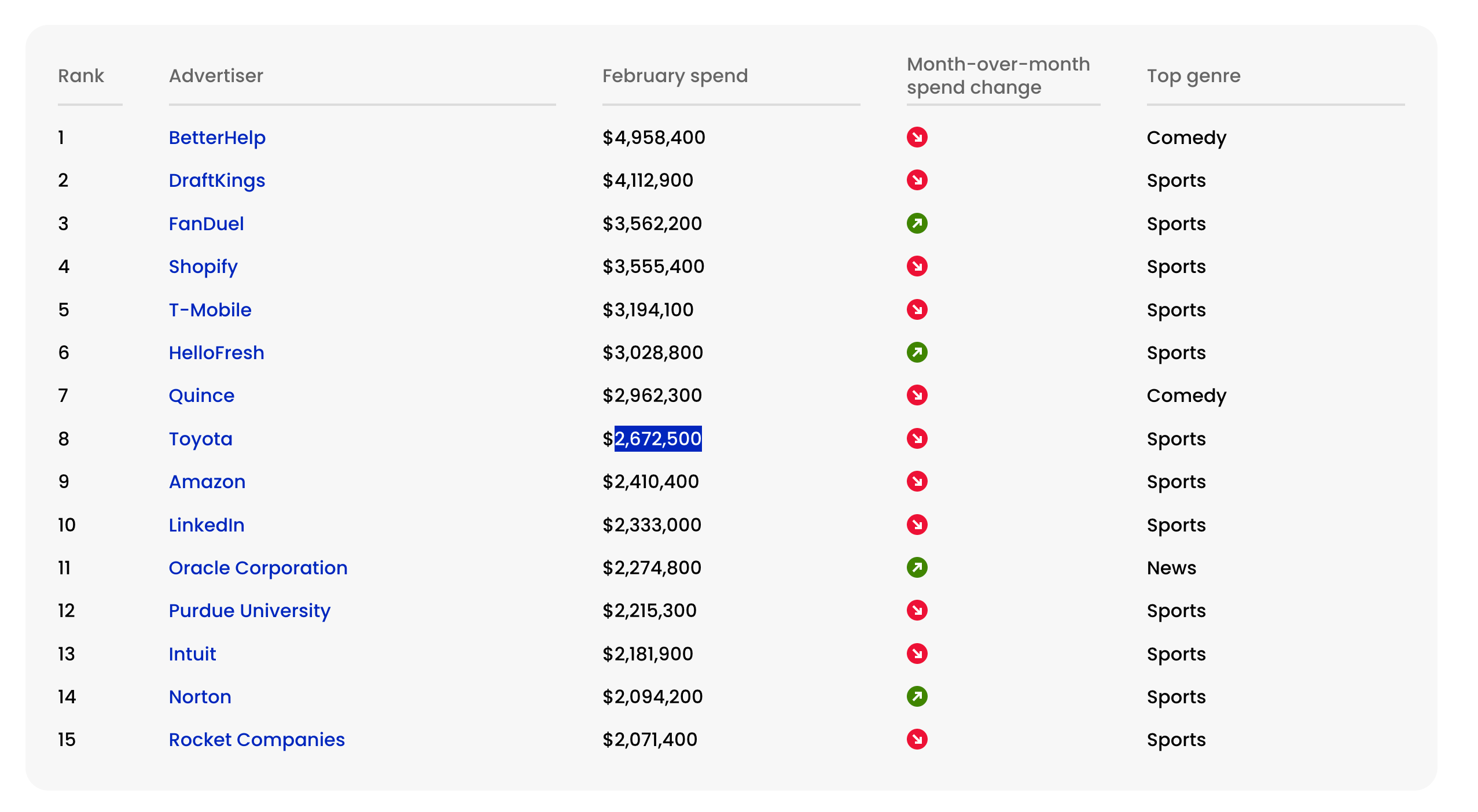 Sports emerged as the dominant genre for top advertisers, with 8 of the top 15 spenders targeting sports content