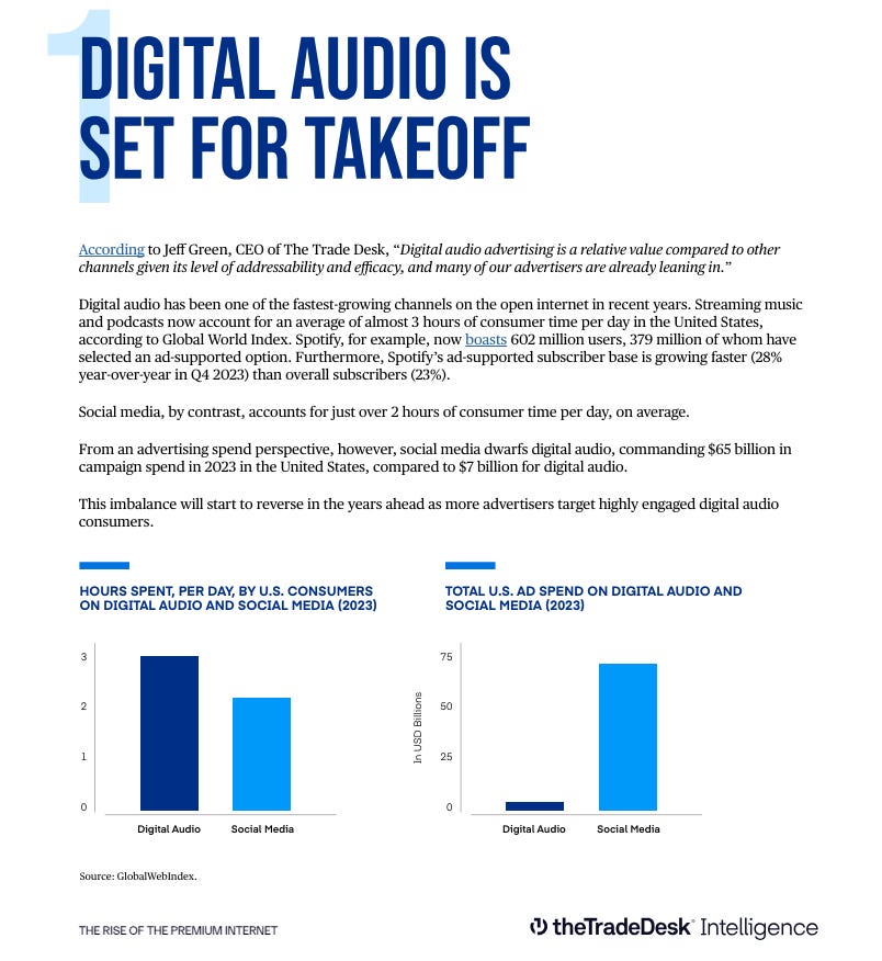 The Trade Desk CEO Jeff Green says, “Digital audio advertising offers great value compared to other channels due to its targeting capabilities and effectiveness, and many of our advertisers are already showing interest.” Digital audio is one of the fastest-growing internet channels. According to a report, Americans spend nearly 3 hours per day streaming music and podcasts. Spotify has 602 million users, 379 million of whom are ad-supported. Spotify's ad-supported subscribers are growing faster (28% year-over-year in Q4 2023) than overall subscribers (23%). Consumers spend just over 2 hours per day on social media. Social media dominated US campaign spend in 2023, with $65 billion compared to $7 billion for digital audio. As more advertisers target engaged digital audio consumers, this imbalance will reverse.