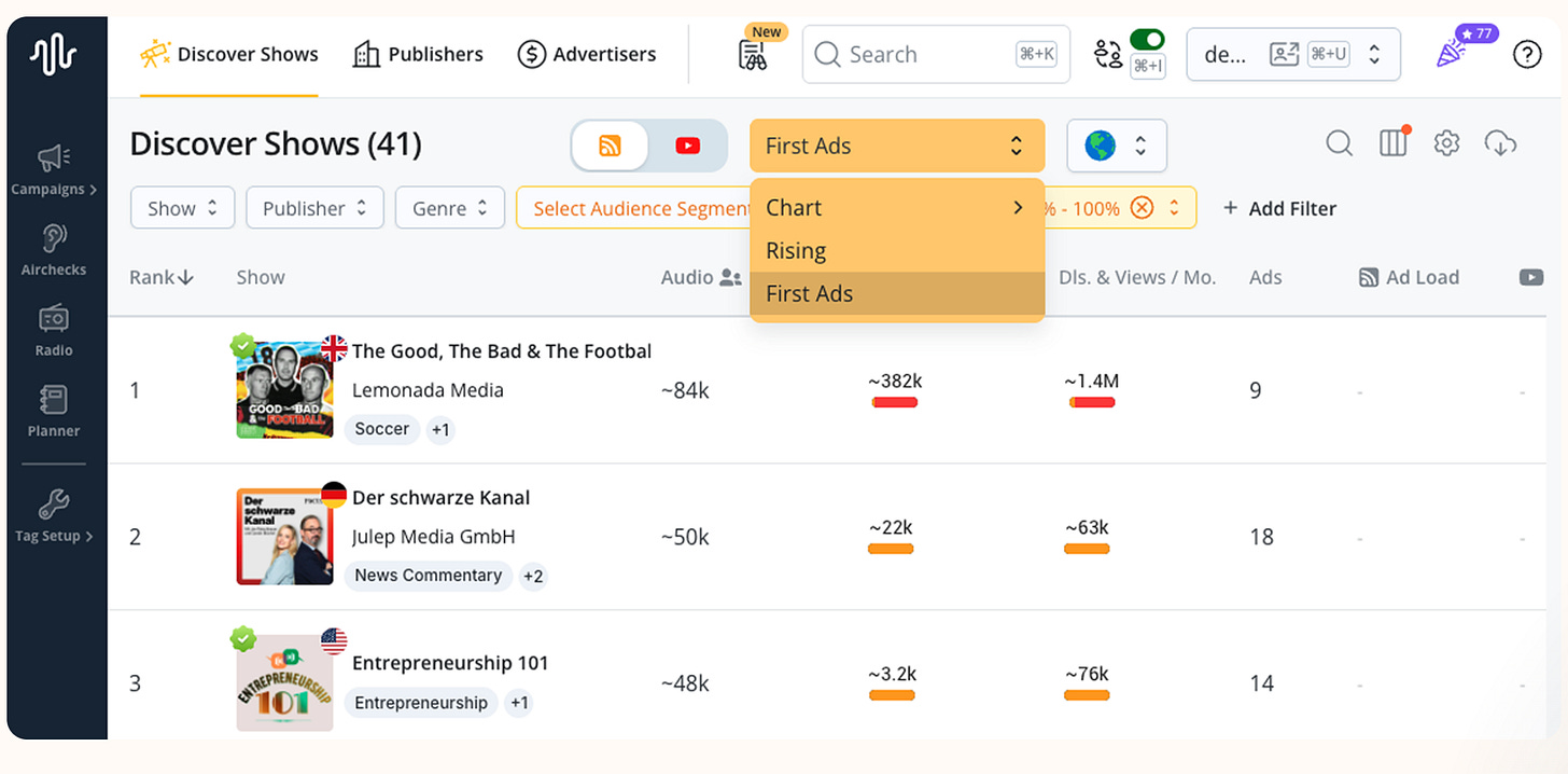 First Ads ranker surfaces shows running their first advertisement in the past 90 days, signaling new monetization opportunities with potentially flexible rates and limited advertiser competition