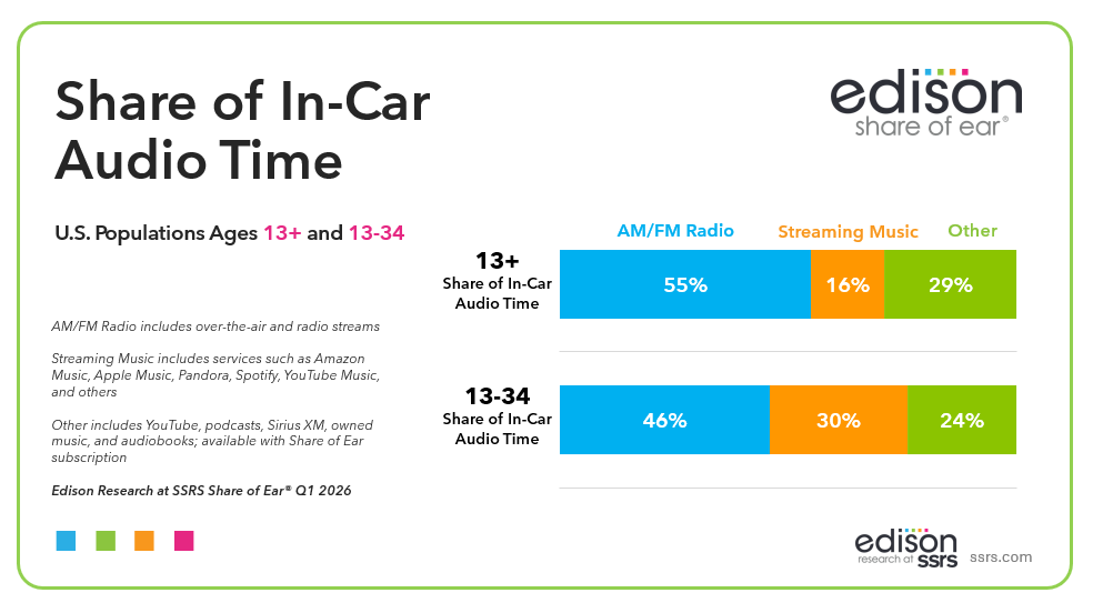 The generational gap is significant: among Americans 13-34, AM/FM radio’s share drops to 46% while streaming rises to 30% — a narrowing but not yet closed gap