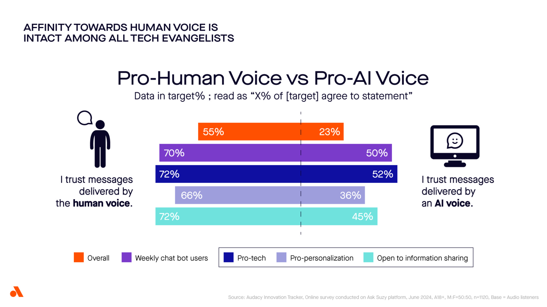 While AI brings evident benefits for efficiency and creativity, the trust and connection formed by the human voice are irreplaceable. From radio ads to podcasts, these channels have become important pieces within how brands reach consumers—focused on authenticity, human touch, and real relationships.