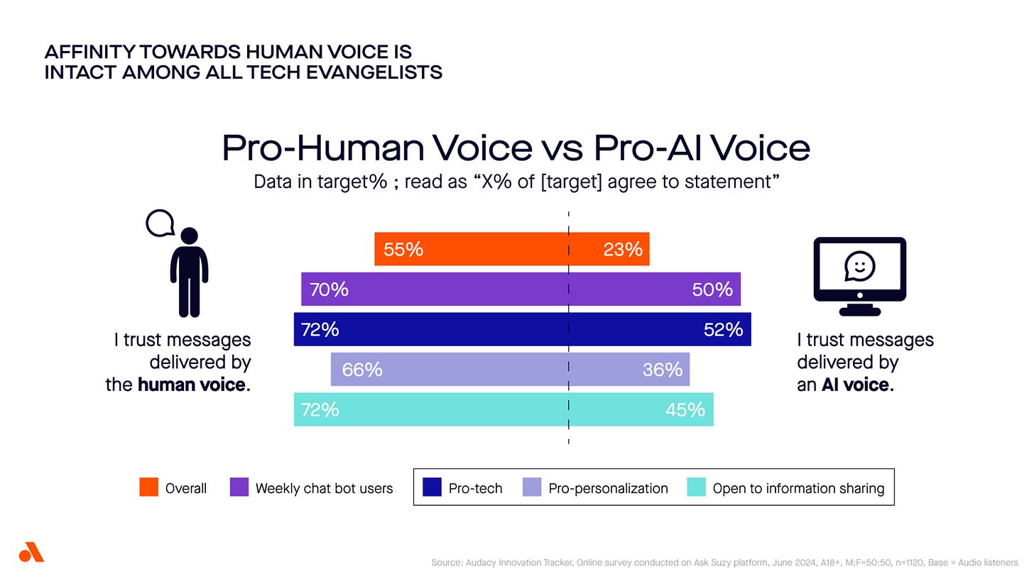According to Audacy's Innovation Tracker, 55% of people more trust the human voice, compared to the 23% placed on AI-generated content. It means consumers have increased trust and confidence in the brand with stronger preferences for humanly crafted audio ads as compared to AI-generated content. Audio channels like radio and podcasts, in this regard, are that specific way through which brands seem to connect with their audiences very deeply. Radio hosts are trusted more than social media influencers to deliver the news, 56% vs. 22% of respondents, and sports commentary, 40% vs. 21% of respondents. On discussing social issues, huge majorities favor podcasters: 43 percent versus just 34 percent for the other platforms.