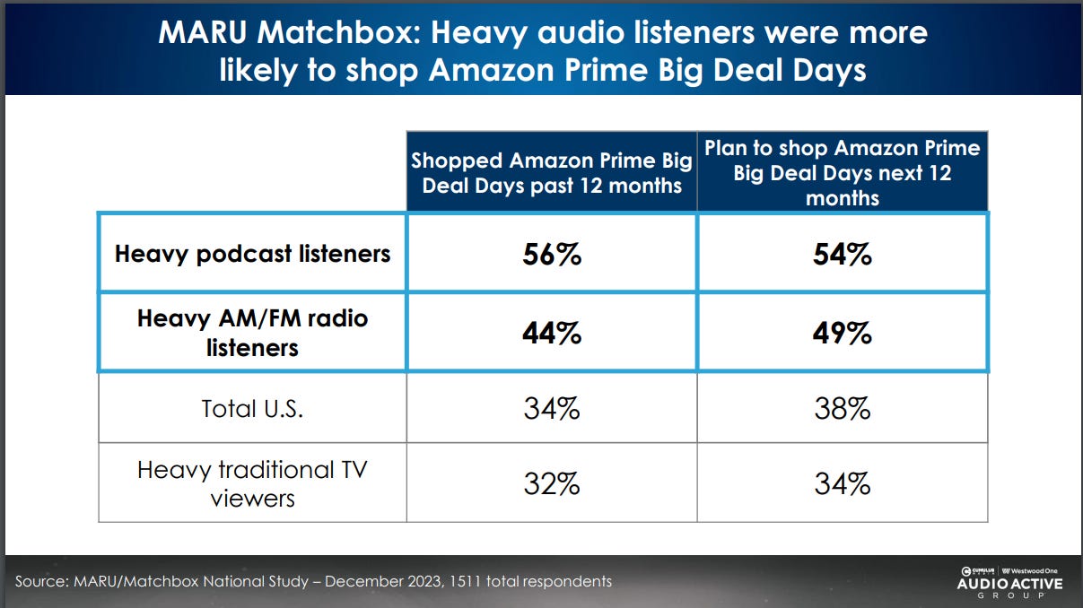 AM/FM radio and podcasts are direct-to-converted paths from awareness into actionable outcomes within Amazon Prime Day, proving just how engaging they are in shopping promotion activities.