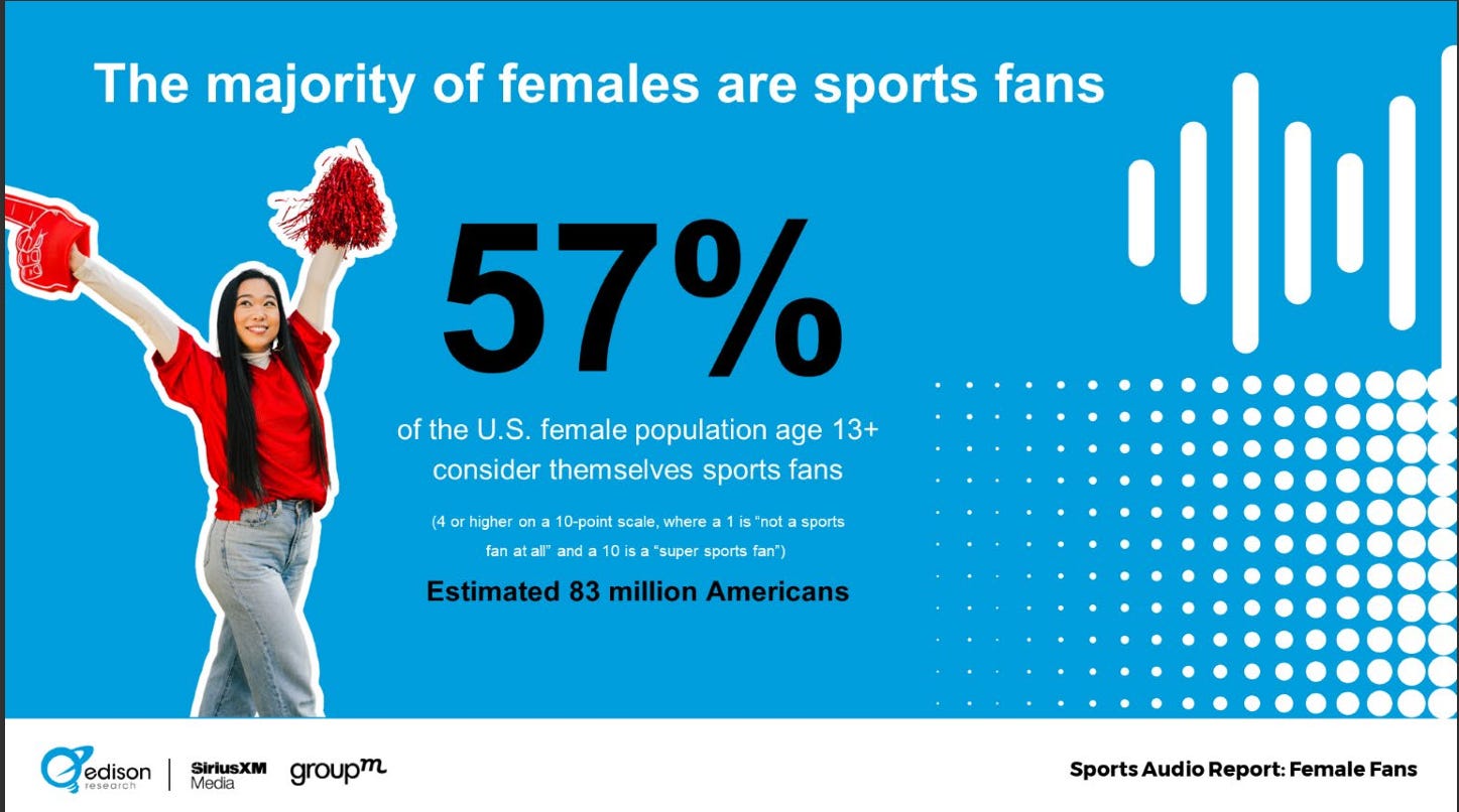 The report pointed out that 57% of female sports fans had "frequently" or "occasionally" consumed sports audio content over the past year. The data was presented in a webinar by Salma Aly, Manager of Research at Edison Research, and Sophie Anderson, Associate Director, Podcast Sales Marketing at SiriusXM Media.