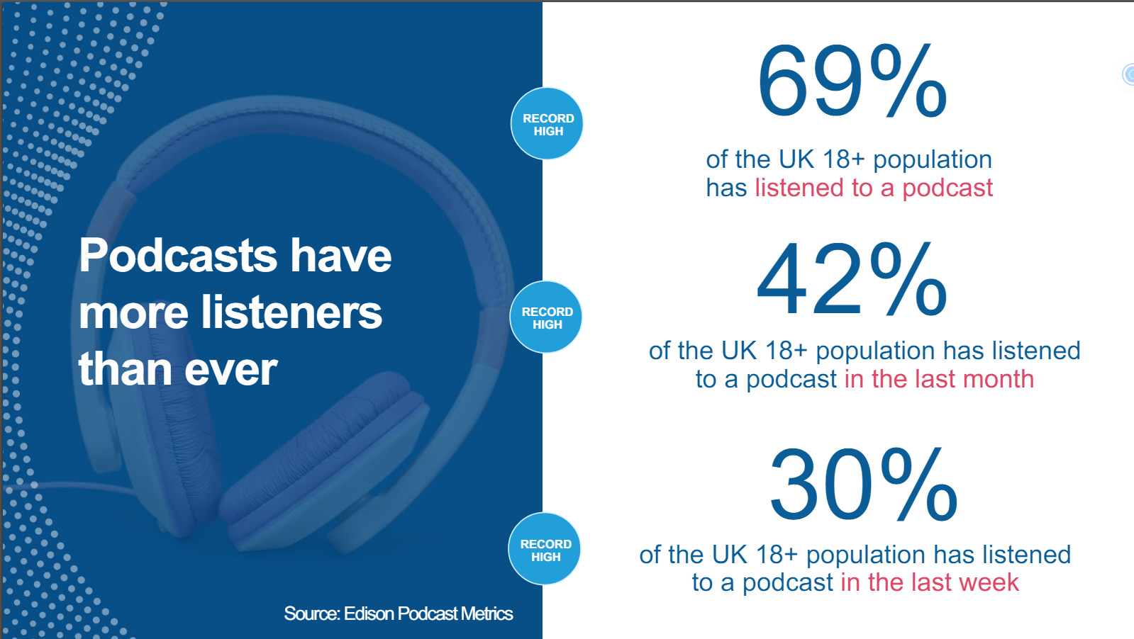 The UK Podcast Consumer 2024 is based on the Edison Podcast Metrics UK. Edison Podcast Metrics UK is the only all-inclusive measure of podcasts' weekly reach in the UK.