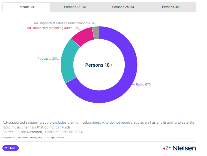 Two-thirds of Americans aged 18 and older listen to broadcast radio. Nielsen and Edison say that radio's podcast lead is small among 18- to 34-year-olds. Podcasts account for 37% of listening time, but young adults still listen to AM/FM radio 45%.