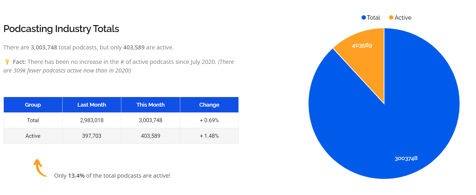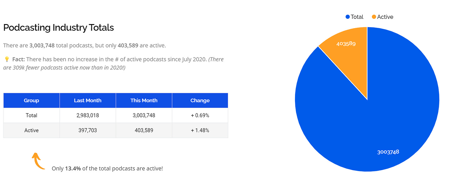 The number of podcasts in Apple Podcasts' directory has surpassed three million! Only 403,589, or 13.4% of the total, are active, though. Furthermore, from 6.8% to 5.9% fewer podcasters were releasing 100 episodes. 0.9% may not seem like much, but when you consider that there are over 3 million podcasts in the mix, that means that 27,000 fewer podcast hosts will reach the milestone in the next two years!