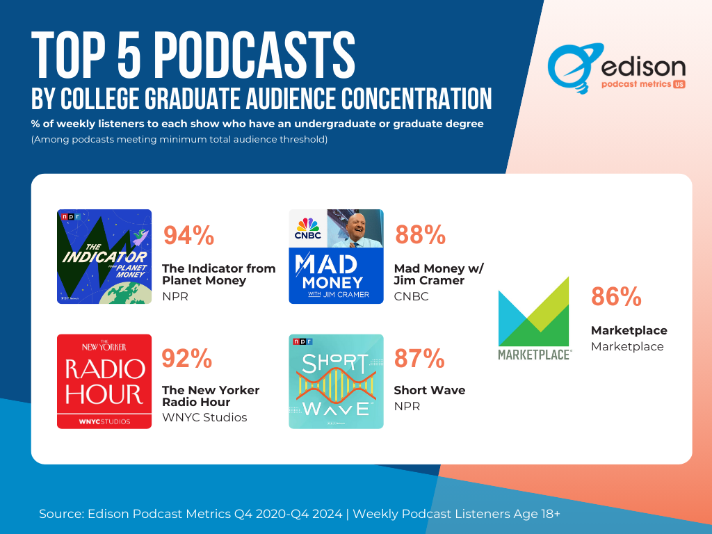 "The Indicator from Planet Money" tops the list with 94% of listeners holding at least a four-year degree