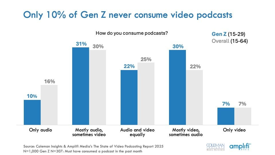 We've got some interesting insights from Amplifi today that back up what a similar study from transistor.fm found: only 10% of Gen Z podcast listeners never watch video podcasts, and 41% still mostly listen to podcasts audio format.